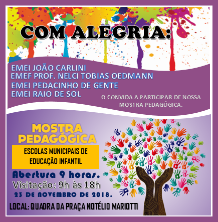 Na oportunidade serão socializadas atividades e projetos desenvolvidos ao longo do ano letivo de 2018. Participarão as escolas EMEI João Carlini, EMEF Professora Nelci Tobias Oedimann, EMEI Pedacinho de Gente e EMEI Raio de Sol. O evento seguirá a seguinte programação: