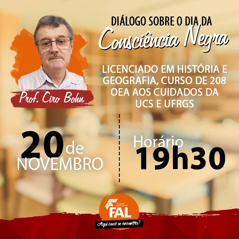 Nesta terça-feira (20) a Faculdade América Latina de Ijuí, realizará palestra gratuita sobre o Dia da Consciência Negra. O responsável por ministrar o diálogo será o professor e historiador Ciro Bohn.