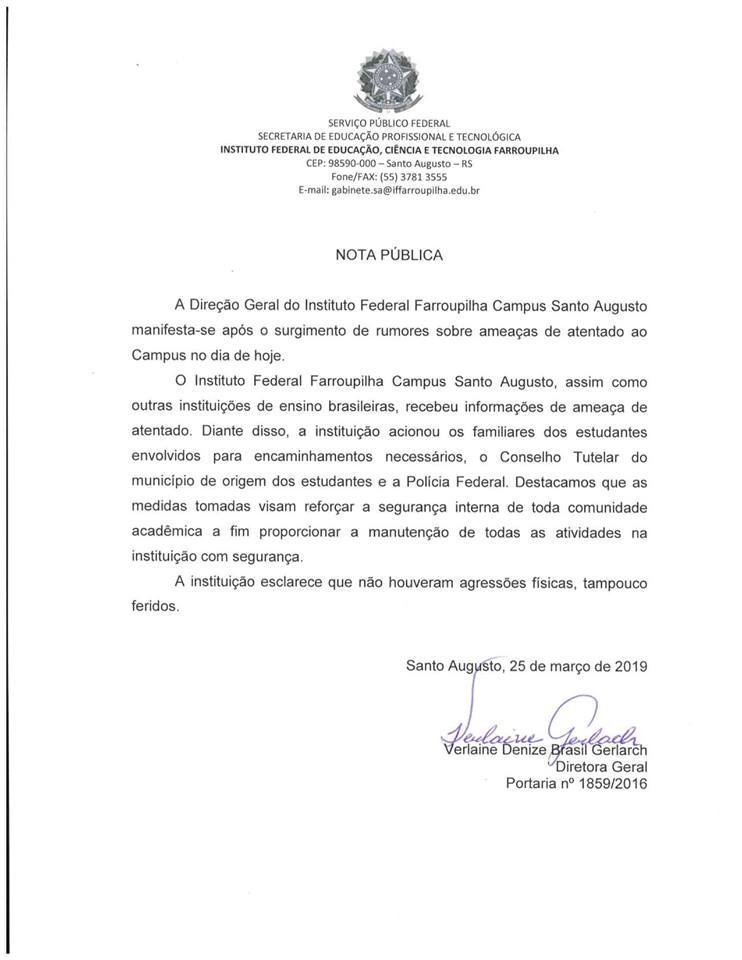 O Instituto Federal Farroupilha Campus Santo Augusto divulgou Nota Pública depois de rumores sobre ameaças de atentado ao instituição.